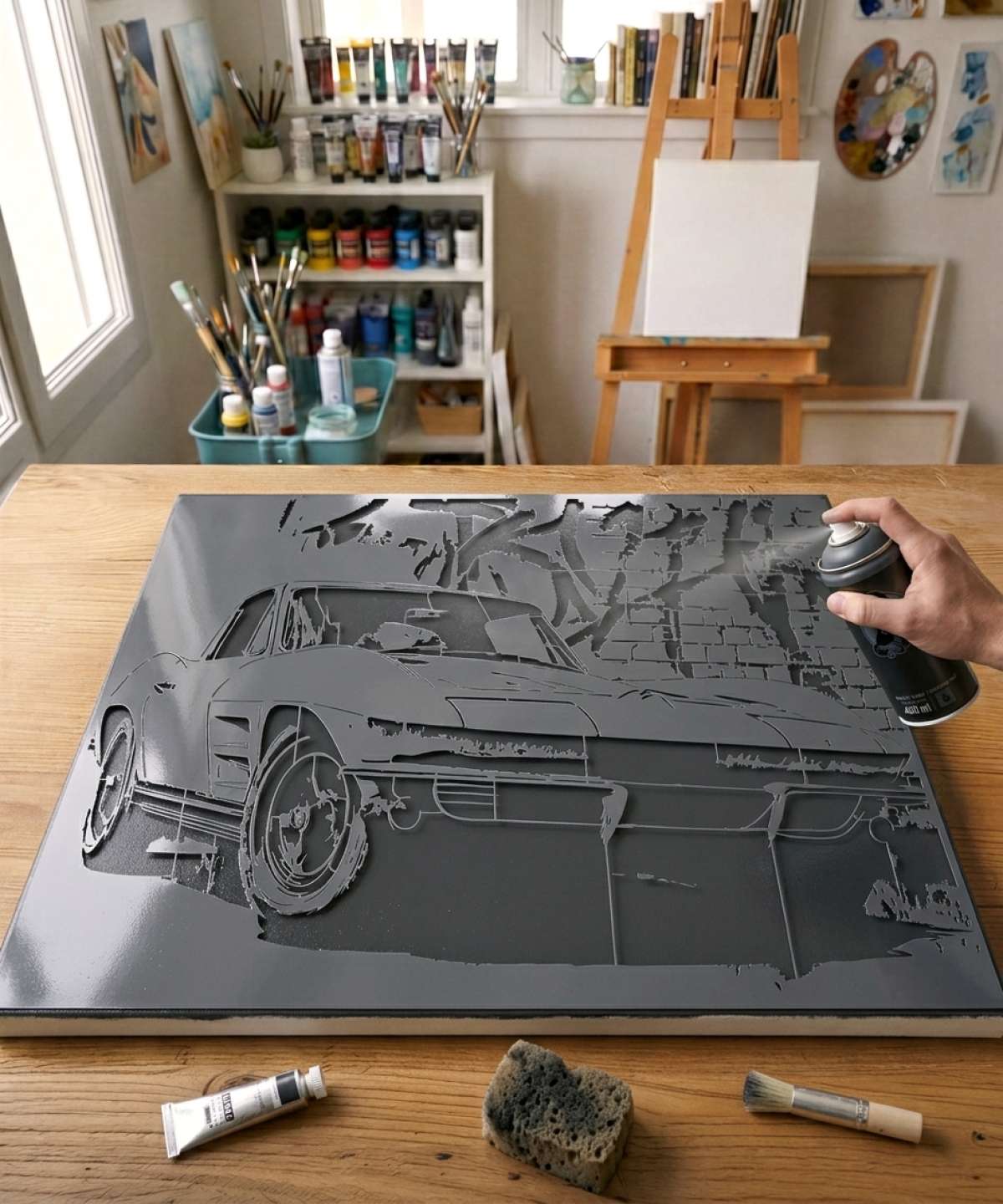 With the 1963 Chevrolet Corvette Stencil, every creative project gains a unique dimension. Whether adding character to an interior, personalizing furniture, creating artwork on canvas, or transforming a wall into a medium of expression, this stencil adapts to countless uses. Its precise and impactful outline makes it easy to reproduce the details of the bodywork along with the energy of the urban aesthetic, resulting in a striking, instantly recognizable finish.