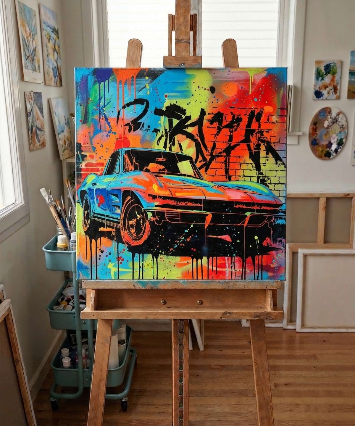 The 1963 Chevrolet Corvette Stencil combines the power of a legendary automobile with the raw energy of street art. Inspired by the world of graffiti and urban expression, this design merges the iconic silhouette of a mythical car with the atmosphere of city walls marked by creative traces. Dynamic, modern, and deeply expressive, it’s a design that never goes unnoticed.