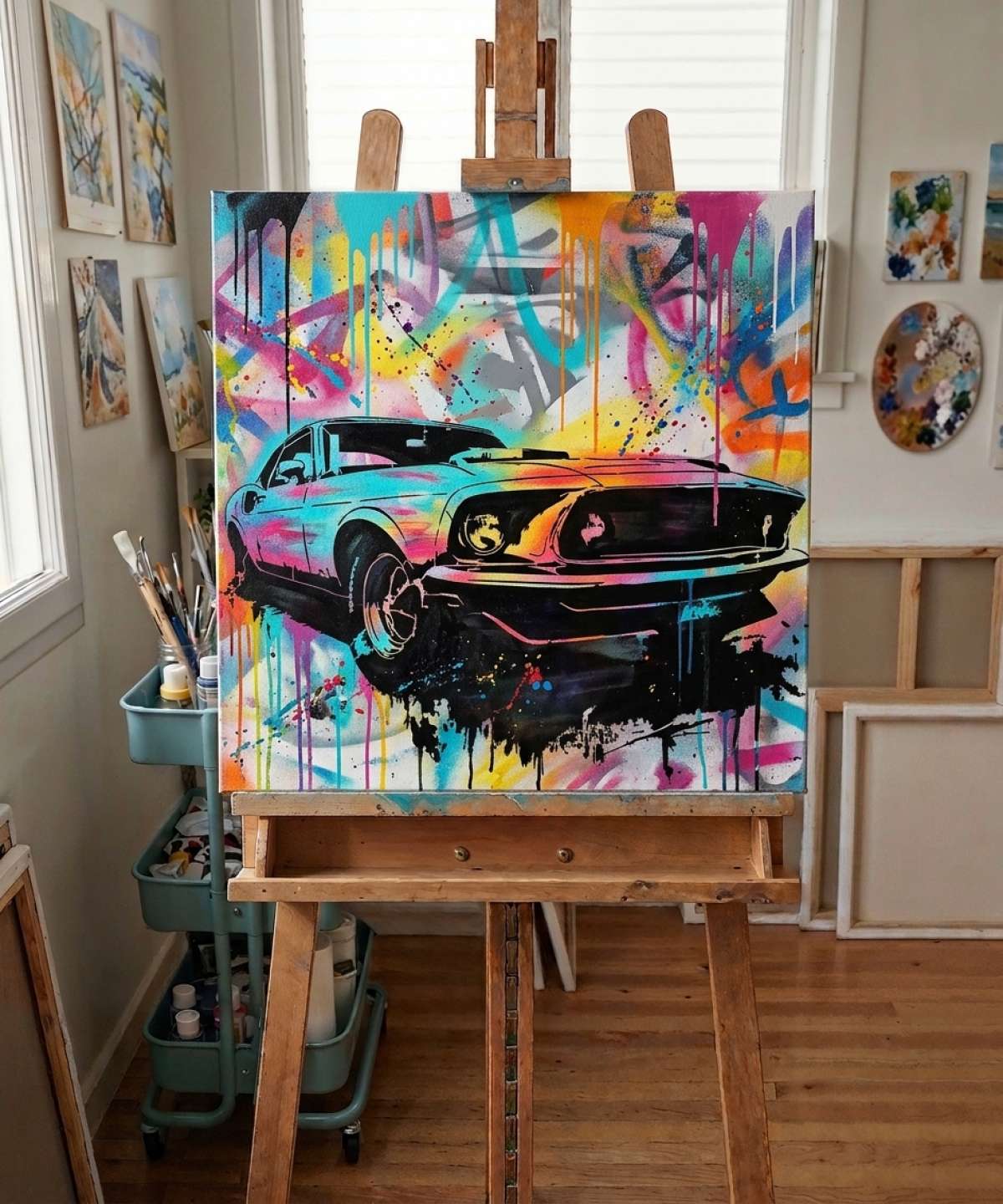 This design speaks to both classic car enthusiasts and urban artists looking for strong visual symbols. It can be used to create impactful artworks, powerful canvases, or custom décor pieces that blend automotive heritage with modern visual culture. The painted rendition enhances this energy with a splash of wild, expressive color—bringing the Mustang roaring into the world of street art.