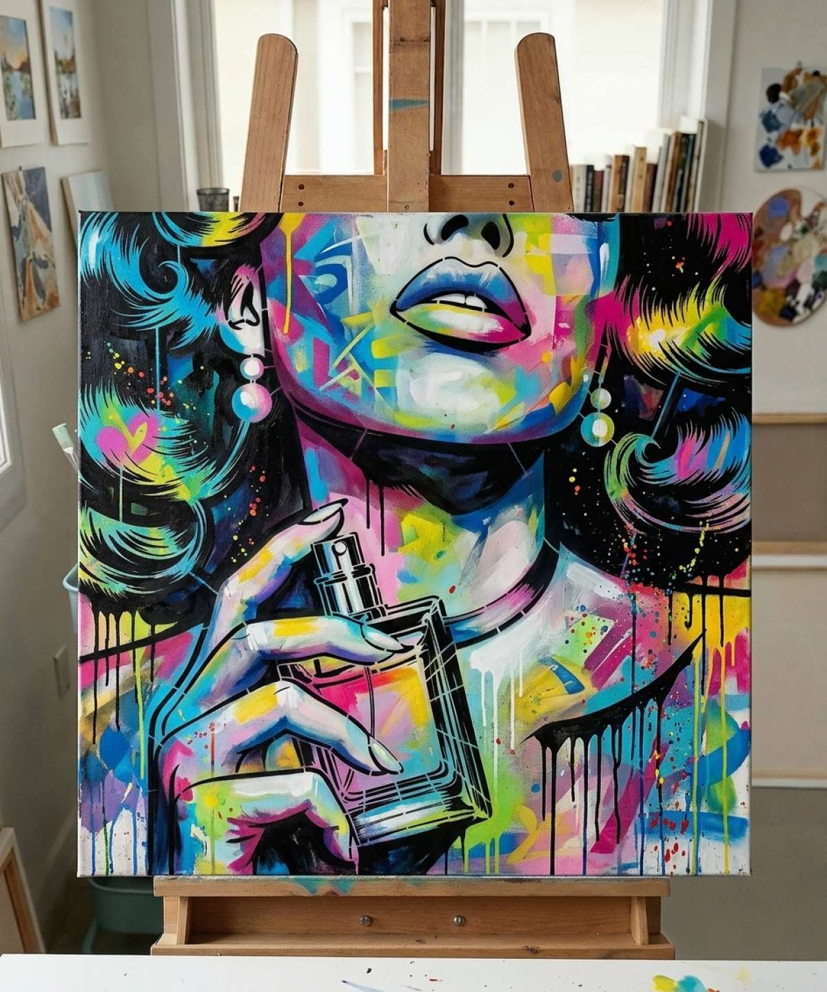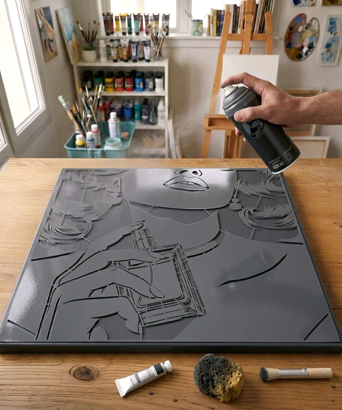 High-Quality Pop Art Stencil Featuring a Glamorous Woman Applying Perfume. Ideal for Creating Vibrant and Sophisticated Artworks.