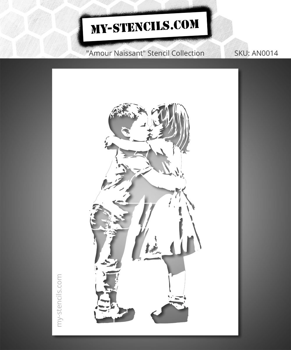 This Kissing Children Stencil represents the symbol of pure love and genuine emotion. Inspired by Banksy’s style, it blends softness and urban contrast to create a work that is both poetic and contemporary.
