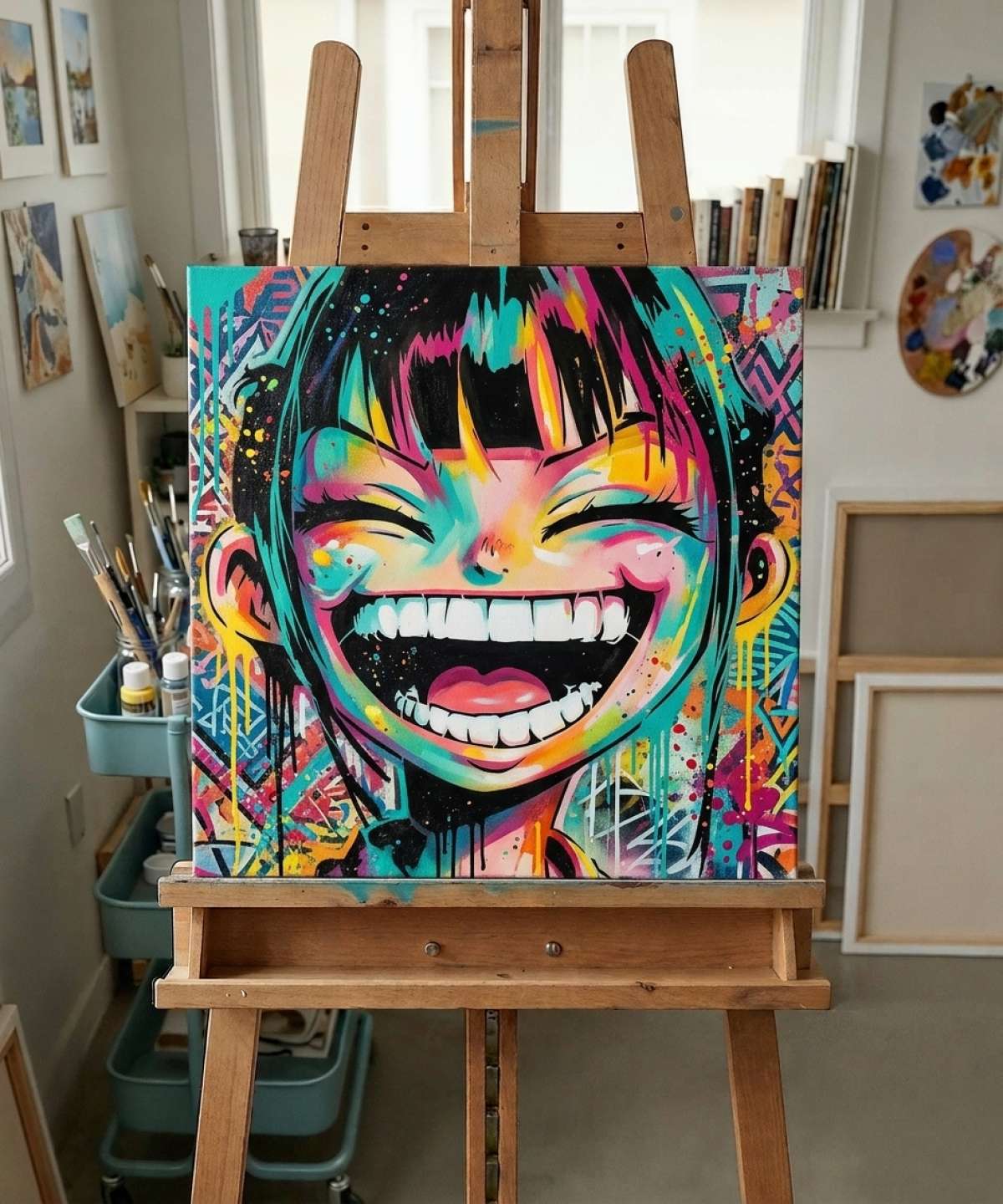 Laughing Manga Girl Stencil – Cheerful manga-style design. High quality, reversible and durable. Perfect for painting, decoration, or artistic projects.