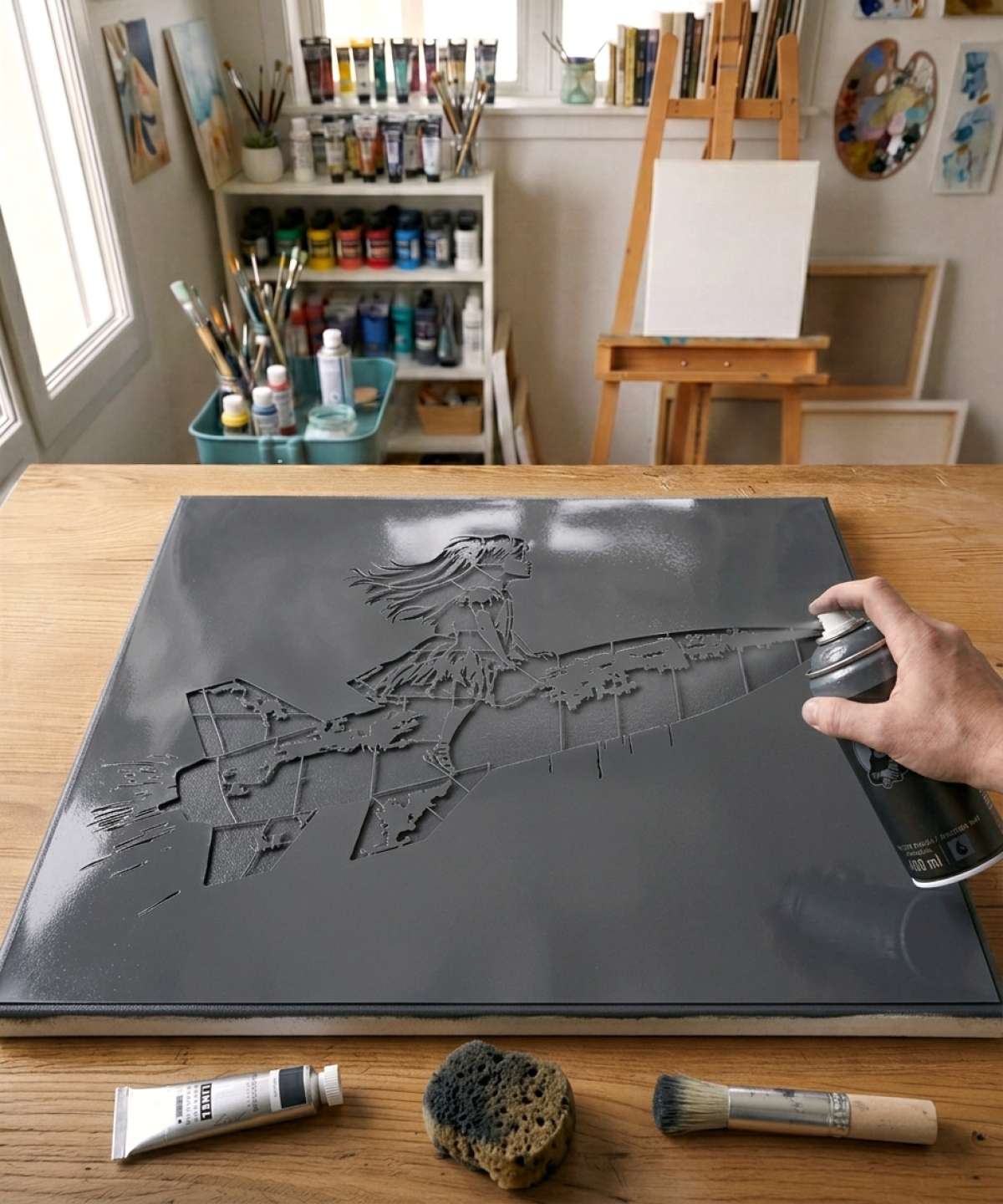 Little Girl and Missile Stencil - High quality for artists. Reusable, reversible, and available in multiple sizes to enhance your creations.