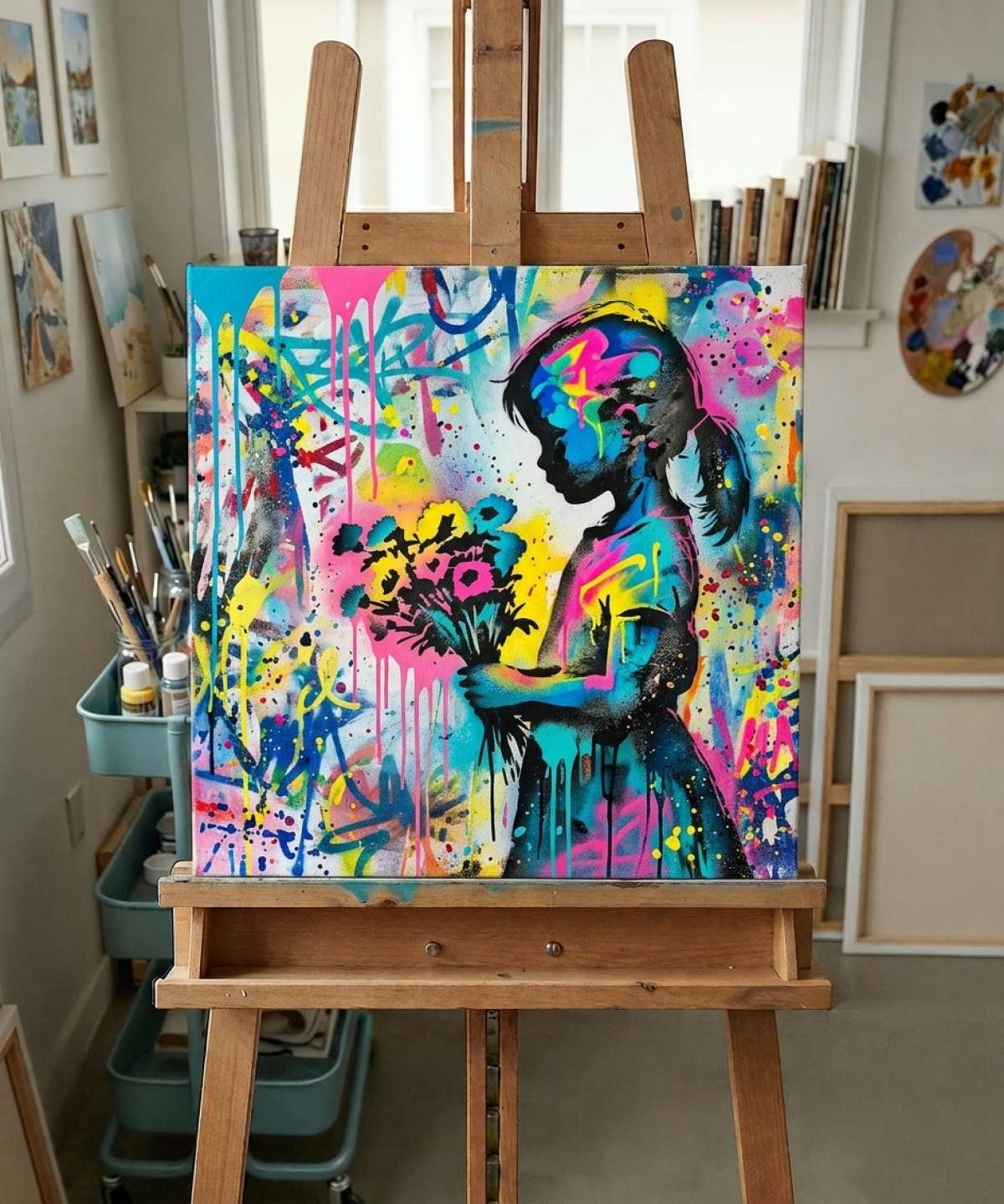 Little Girl Bouquet of Flowers Stencil: reusable, high-quality, and reversible. Available in multiple sizes for unique street art creations.