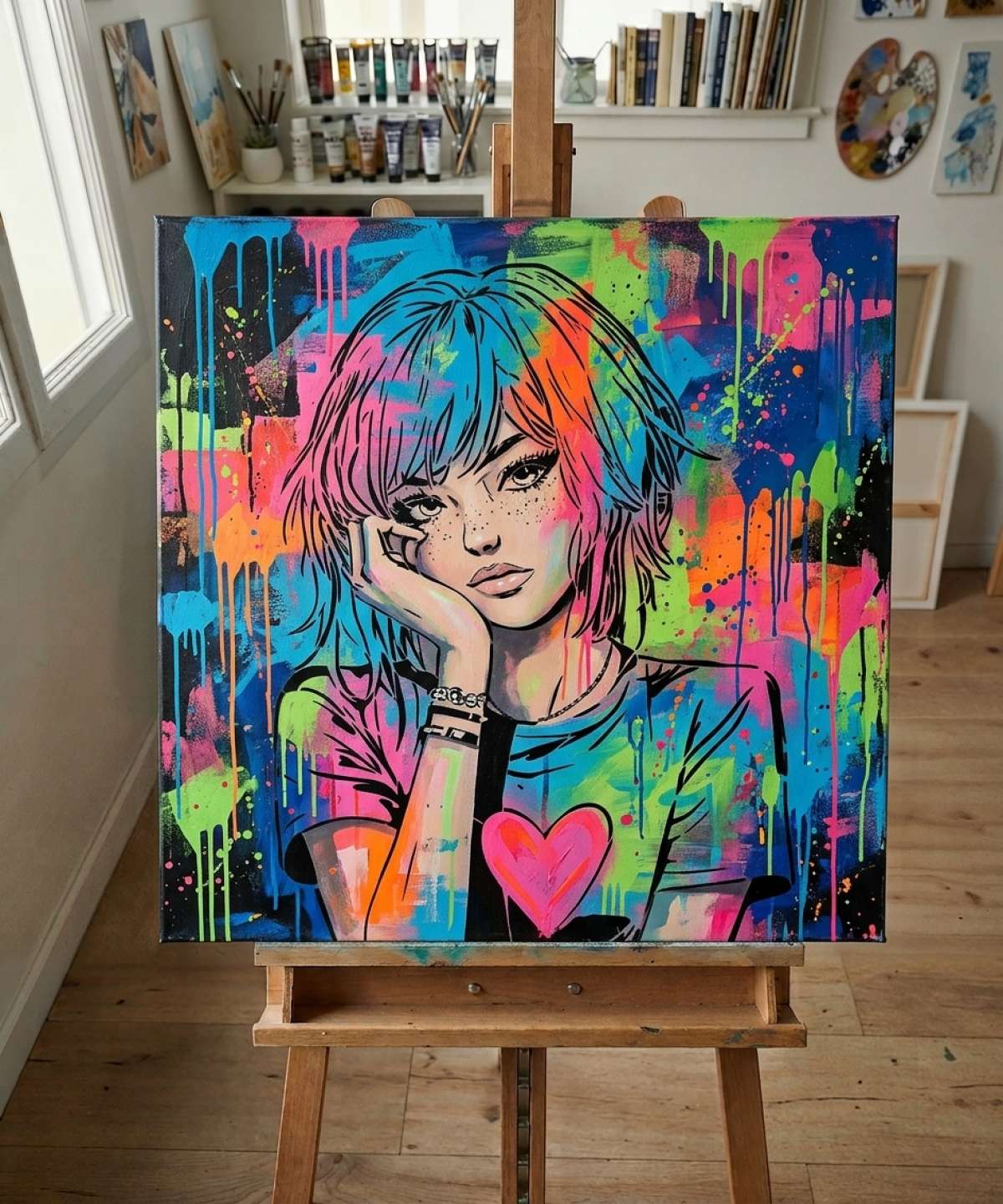 Her slightly tousled hair, expressive eyes, and delicately drawn features create a figure that is both strong and fragile. A heart printed on her t-shirt serves as a symbolic focal point—hinting at open emotion, inner wounds, or simply a graphic signature. This gentle tension between sweetness and weariness gives the stencil its powerful emotional presence.