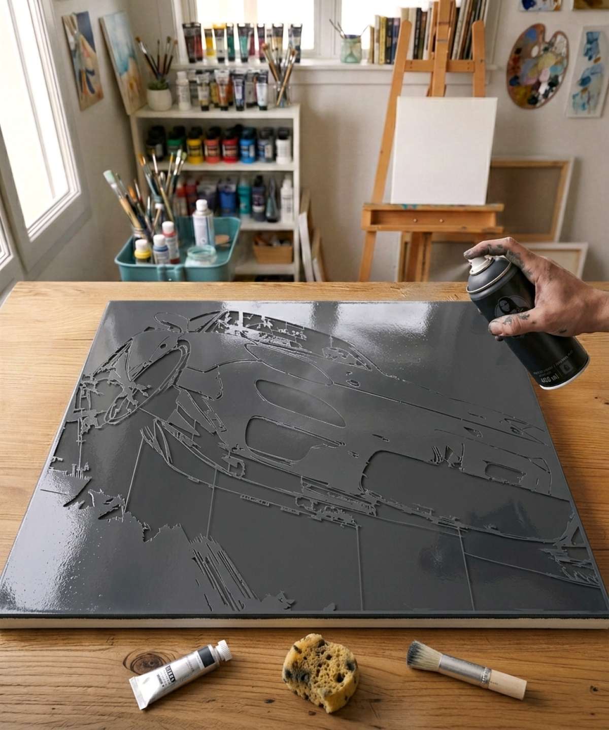 The visual treatment of this stencil heightens the sense of intensity. The lines are sharp, the volumes enhanced through a precise play of textures and negative space. The extreme perspective amplifies the vehicle’s force, as if it were plunging downhill at full speed or attacking a corner right on the edge of traction. The asphalt seems to distort under the pull of its tires, and the frozen moment nearly echoes with sound.
