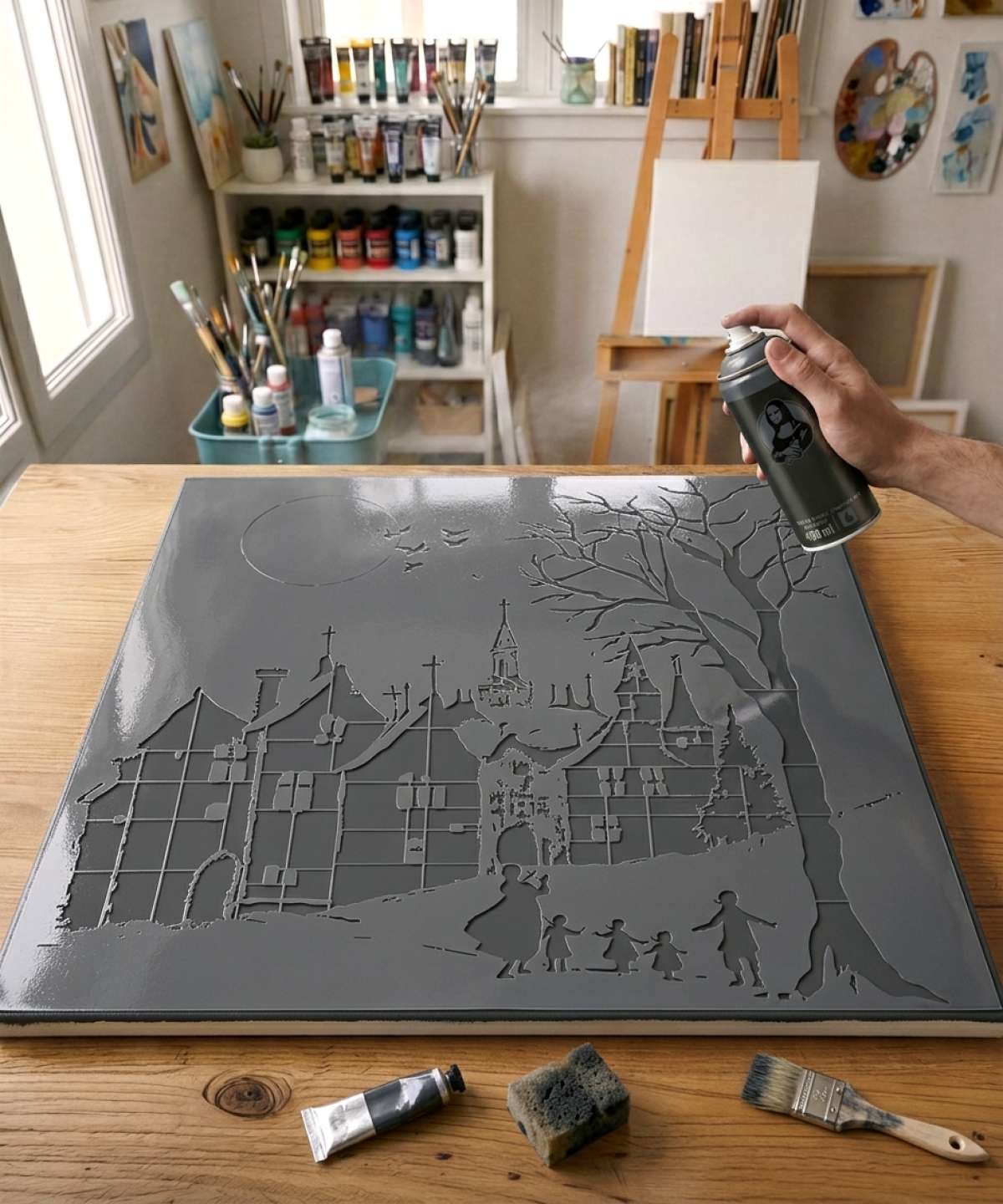 Medieval Christmas Village Stencil: Reusable, reversible, high-quality, and available in multiple sizes for your festive creations and decorations.