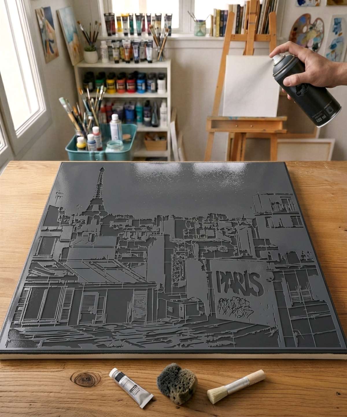 An urban Paris stencil inspired by the rooftops of the capital, blending raw architecture with street art poetry. A strong graphic composition that gives full freedom to textures, colors, and the artist’s interpretation. Ideal for creating contemporary artworks that are vibrant and richly atmospheric.