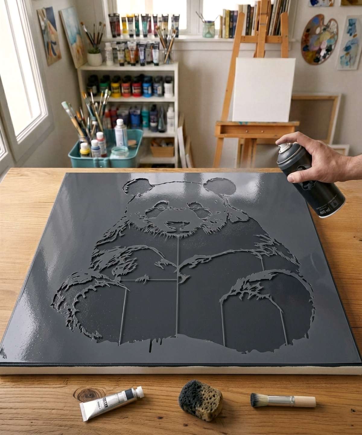 Sitting Panda Painting Stencil – Reusable Artistic Tool. Perfect for creating a unique mural or painting inspired by Zen and nature.