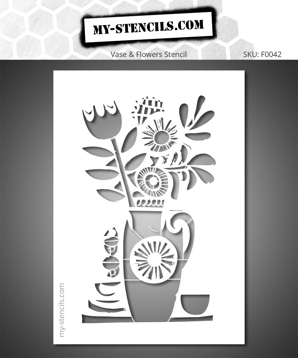 This stencil showcases a stylized floral still life, centered around a vase and a bouquet composed of simple, expressive shapes. The flowers, leaves, and surrounding objects are distilled to their essence, treated as graphic motifs rather than realistic elements.The composition is frontal, structured by bold areas and contrasts. The vase, solid and grounded, serves as a base for a freer floral ensemble, punctuated by circles, rays, and repeated shapes. Each element acts as a symbol, contributing to a coherent and balanced visual language.