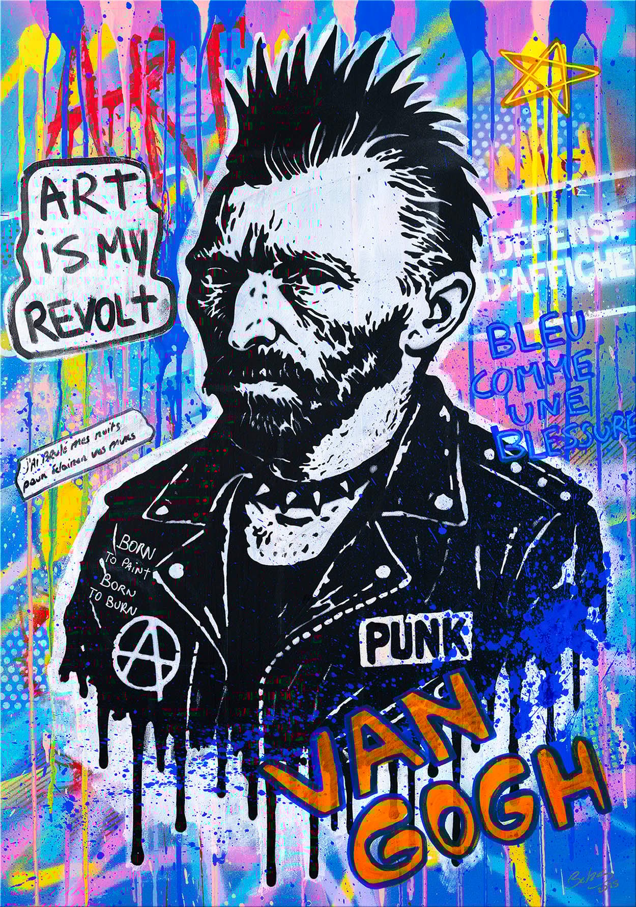 The portrait preserves Van Gogh’s defining features—his intense gaze and expressive face—but places him in a radically different universe. Dressed in a punk jacket adorned with anarchist symbols, zippers, and a bold “PUNK” badge, he becomes a symbol of independence and boundless creative freedom. The dripping paint effect surrounding the silhouette adds a dynamic, urban dimension, as if the piece had just been painted on a freshly claimed street wall.