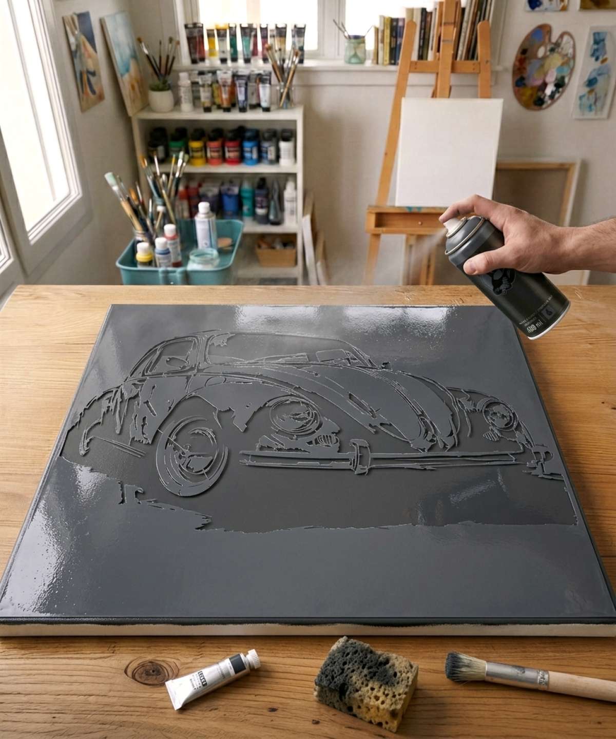 This stencil offers a raw and stylized visual language: with irregular textures, deliberately broken or incomplete areas, and a fragmented treatment of the bodywork, the car appears worn and alive. It feels as if it has been rolling across the asphalt of collective memory for decades, soaked in stories, colors, and cultures.