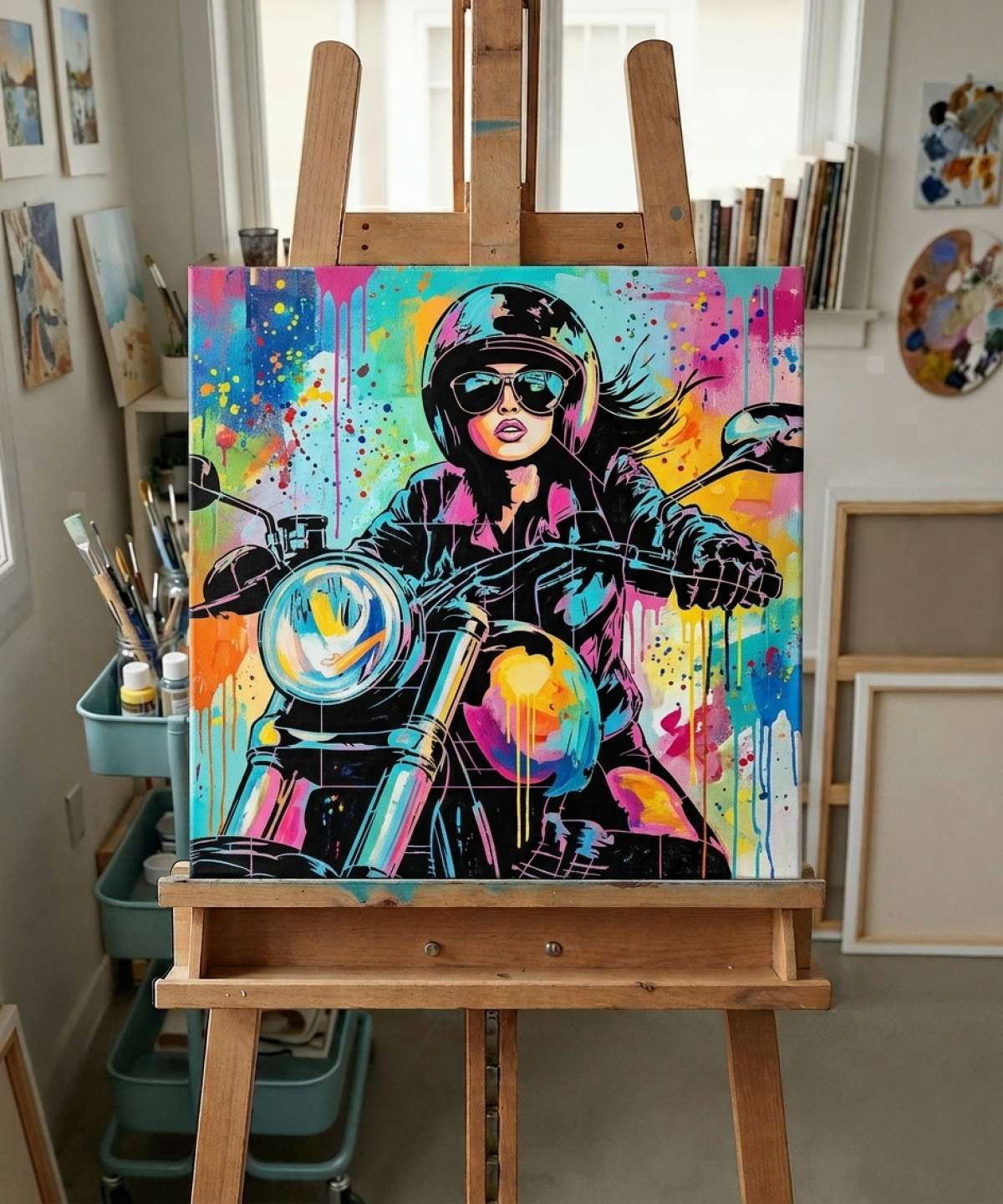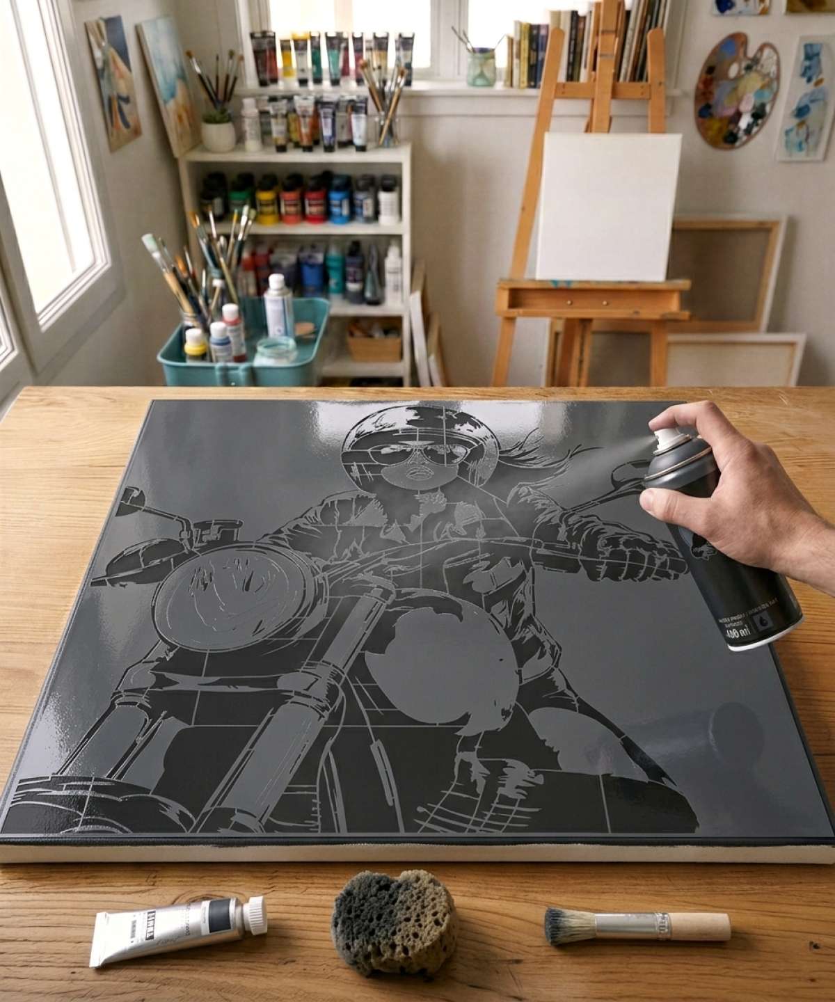 The woman on motorcyle stencil is reusable, reversible, and made with premium quality. Available in various sizes, it’s perfect for your artistic creations.